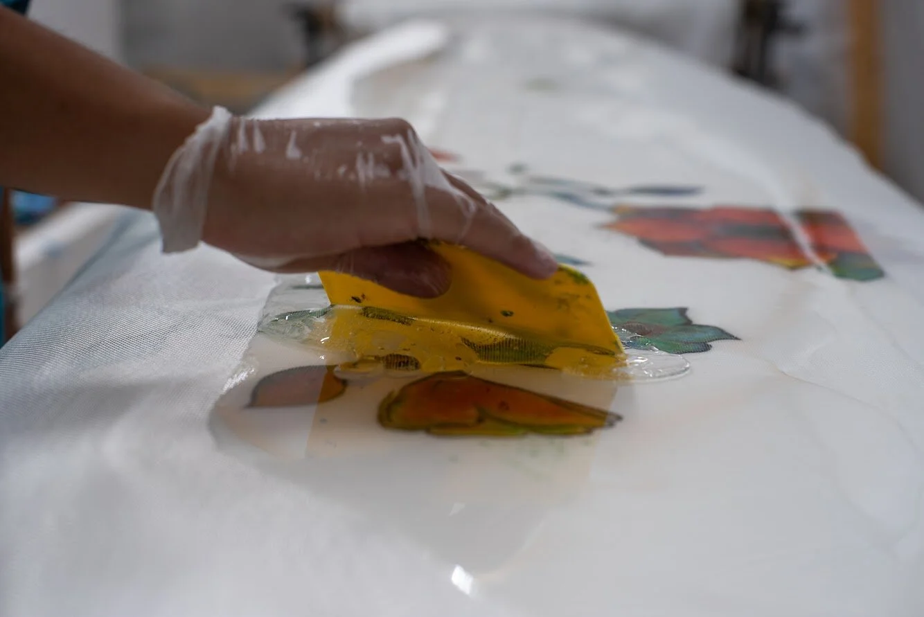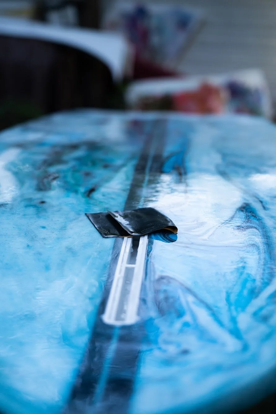 Whether art is on the boards, a carbon fiber weave with fiberglass is laid in the center to add strength. Next, fiberglass is laid out over one side of the board and cut to the board's shape with a bit of hanging off the edge. Epoxy resin is mixed with a hardener and then poured into the fiberglass. The resin is then squeegeed so the fiberglass is saturated and there are no resin pools. The resin requires 4-6 hours to cure, and the same process is repeated on the other side of the board. Next, a whole is cut for the leash plug. A layer of just resin is applied to one side of the board, and the board is left to cure. This process is repeated on the other side of the board. An optional third layer of resin can be applied to both sides. Once the board is glassed (layered fiberglass with resin), the fin boxes are created by sanding, and the whole board is fine-sanded. The board is then polished and ready for the water.
